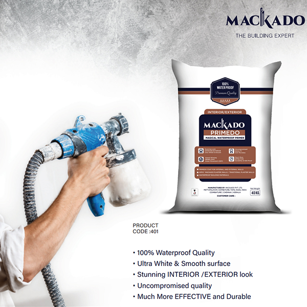 Mackado White is a premium and magical wall putty with ultra fine powder made of Mackado binders, multi-polymers, high grade hydrate/ non-hydrated minerals and white cementitious materials. It is a perfect premixed magical white dry-mortar. It fills the cracks/ imperfections/ gaps/ and also protects from water leakage, sunlight and other environmental stresses. It is different from other wall putty by its super whiteness, waterproofing, durability and other unique benefits to your walls.Mackado Primedo is a premium quality undercoat content for cementitious plastered wall in the form of powder. It is different from traditional white-wash by its superior colour, high water proofing feature and primer touch. Mackado Primedo is stronger, smoother, whiter and more adhesive, durable and user friendly than normal white-wash (white cement) and primer; apart from the benefits of higher coverage, waterproofing, heat resistance and eco-friendly. This product is a combo of traditional white-wash and primer with a number of additional benefits to the customer, including economical savings.